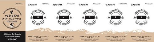 5枚つづりのクーポン券になっているので、お一人でもグループご家族でも使えて便利です。信越自然郷スーパーバリューチケットは、信越自然郷エリア(長野県&新潟県)の飯山市、中野市、山ノ内町、信濃町、飯綱町、木島平村、野沢温泉村、栄村、妙高市の、22スキー場でご利用いただけるリフト1日券の他、お食事券や温泉入浴券など、お得なバリューが満載! 5枚つづりのクーポン券で、お一人さまでもご家族やグループでもお使いいただけます。