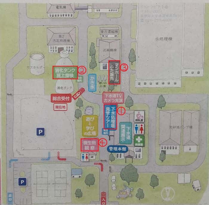 スタッフによると、下水処理場見学ツアーは赤枠の建物内を見学するそうです。